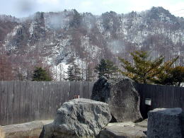 露天風呂から見た景色。おそらく向うに見えるのが「仏岩」なのでしょう。仏岩は山頂に長野県最古といわれる宝篋印塔(ほうきょいんとう)がある岩峰だそうです。