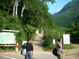 | 列車利用の場合、湯田中からはバスで上林温泉までバスで行き(約15分)そこから徒歩(30分)というコースと、湯田中駅からタクシーで渋温泉から林道で地獄谷温泉の駐車場まで行き(約1800円)、徒歩10分というコースの2パターンがあります。予約時に宿の女将さんが「5人ならタクシーの方がいいですよ」と教えてくれたので迷わず後者を選択。林道は渋の温泉寺から入るのですが、すれ違いのできない舗装道路。所どころに待避所があるので、渋・湯田中の宿に泊まってチェックアウトした人が観光に来る時間帯(9時〜11時頃)をはずせば、それほど難渋はしないでしょう。ただし、タクシー運転手さんによると冬場は基本的に土日にしか除雪しないので通れないようです。電話で確認する必要があります。 |