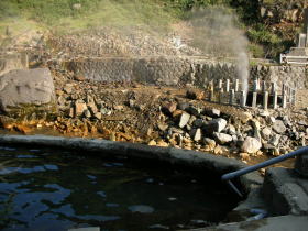 | 国の天然記念物「渋の地獄谷噴泉」も川を挟んで目と鼻の先に見え、風向きによっては10mほども吹き上げられた温泉が霧状になって野天風呂まで飛んできます。 |