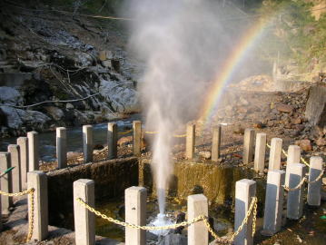 | はるか昔から噴出し続ける地獄谷の大噴泉。天明3年(1782)の浅間山大噴火の時には一時噴出が止まったといいます。 |