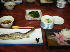 | 夕食、朝食ともに食堂でいただきます。岩魚の塩焼き、茶碗蒸し、鯉のあらい、天ぷら・・・ |