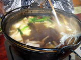 | メインは鴨鍋。うどんを食べて、仕上げは鴨雑炊・・・満腹です。 |