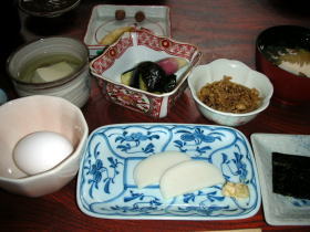 | これぞ清く正しい日本の朝食。先ほど野天風呂脇で茹でていた温泉玉子もあります。 |