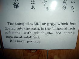 浴場には至る所に英語の掲示があります。タクシーの運転手さんの話では若女将がなかなか英語が堪能とのこと。外国人観光客も多いようで、この日も1組泊まっていました。でも「混浴」を"Mix"とするのはちょっと無茶かも(笑)