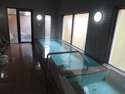 | 男女それぞれの浴場には内湯と露天風呂があります。浴場は思ったほど広くはないのですが、タイル張りの湯舟がきれいです。内湯は湯舟が2つに分かれていて、2人入れば満員御礼の小さい方の湯舟には源泉が注ぎ込まれていて熱めの湯。大きい湯舟は小さい湯舟からオーバーフローした湯が注がれる仕組みで温めの湯となっています。 |