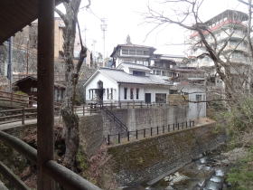 | 露天風呂は4人ほど入れるサイズ。川沿いにあるのですが、竹垣で囲っているため(のぞき窓はありますが)眺望はよくありません。囲いがなければ文殊堂や薬師堂も見えるのですが、逆に外からも丸見えなわけで、仕方ありません。写真は五台橋から見た文殊の湯。 |
