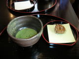 チェックインすると、ロビーで抹茶と温泉まんじゅうのおもてなし。