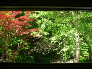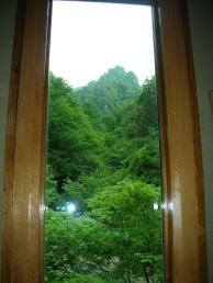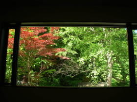 | 角間渓谷は「日本森林浴の森百選」に選ばれているだけあって、窓越しに見る緑も素晴らしいの一言。 |