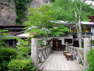 | 実際は国道との分岐点から車で5分ほどなのですが、深緑が辺りを覆っているせいでしょう。ずいぶん山深くまで踏み込んだという印象を受けます。駐車場に車を置き、橋を渡って館内へ。 |