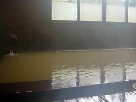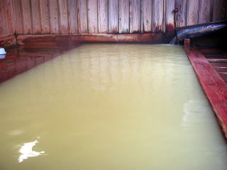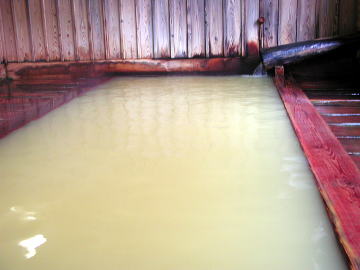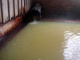 湯舟から黄褐色の湯が溢れます。源泉温度35.4℃の湯を42℃に加熱してかけ流しているそうです。