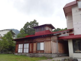 右の写真はホテルの左端にある湯小屋。目指す緑の湯はこの中にあります。 |