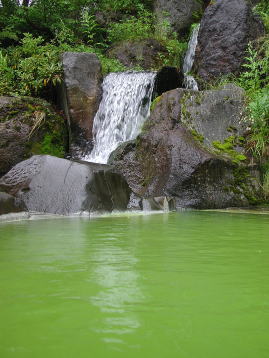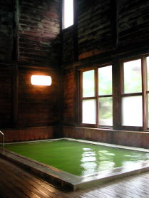 2004年発行の『自遊人・10月号別冊・温泉図鑑』で、熊の湯ホテルの湯舟に湯が注がれていく様子を観察した写真が紹介されていました。どうも注がれる時からすでに薄緑色をしているようで、硫黄泉によくある、はじめは透明でも空気に触れ、酸化して白濁するタイプとは異なるようです。