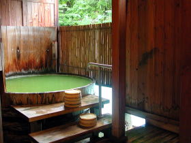 2005年に初めて訪れた時は女性専用半露天風呂として、右の写真のような樽風呂(地元山ノ内町の造り酒屋・玉村本店で100年ほど前に作られ、醸造用に使われていた仕込み桶を利用したもの)がありましたが、銅製の箍(たが)が老朽化したために使用できなくなったそうで、2010年に再訪した時には、木造りの露天風呂が新設されていました。 |