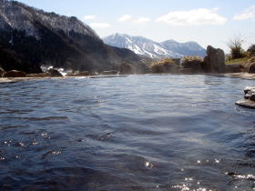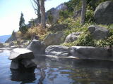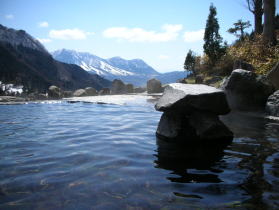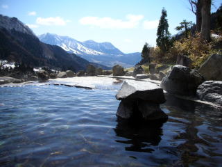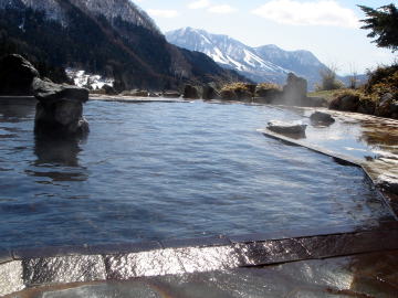 | 南に向かって見下ろす形で視界が開け、視線の先には北信濃の名山、高杜山(1351m)が見えます。いつまでもぼーっと浸かっていたい野天風呂です。 |