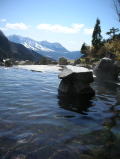 | この日は奥山田温泉満山荘の帰り道、車のフロントガラスの正面に連なる壮大な北アルプス連峰を見ながらのドライブだったせいでしょう。絶景が自慢の望郷の湯ですが、正直なところさほどの感動はありませんでした。「絶景」というよりはやはり「望郷」というのがふさわしい気がします。開放的な野天風呂から見える風景はどこか懐かしく、ほっとするような眺めでした。 |