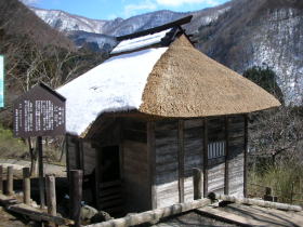 右の茅葺き屋根の建物は明治20年築の水車小屋で、平成元年にこの地に移築された村の有形文化財です。 |