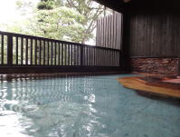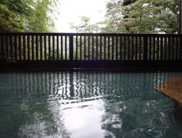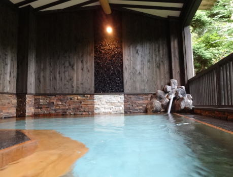 | おもとや旅館時代には内湯だった浴場を庭園側の壁を取り払い、半露天風呂に改築しました。新・満山荘会心のリフォームではないでしょうか。素晴らしい浴場です。泉質上足元が滑りやすいのでくれぐれもご注意を。 |