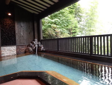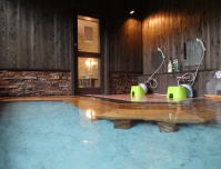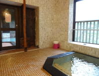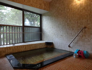 | 内湯は沓掛温泉1号泉(アルカリ性単純温泉。泉温34.7℃pH9.2)を加温してかけ流しています。もちろんいいお湯ですが、どうしても露天風呂にばかり入ってしまいます。 |