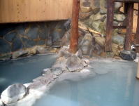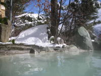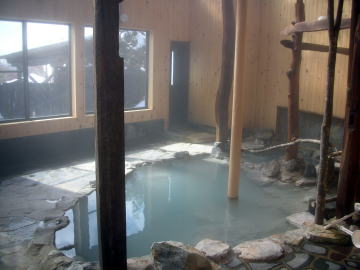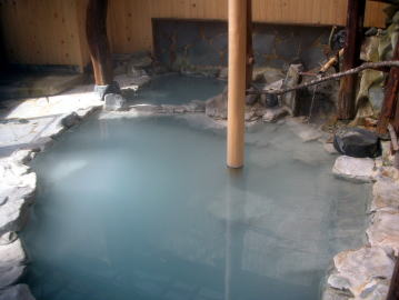 | 大きい湯舟と小さい湯舟がひとつずつ。葛湯のように薄っすらと白濁した湯は見かけとは裏腹にけっこう熱い。もちろん源泉かけ流しです。 |