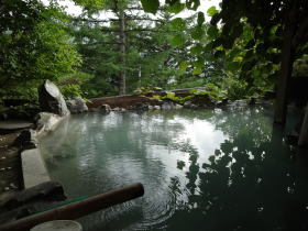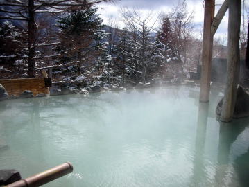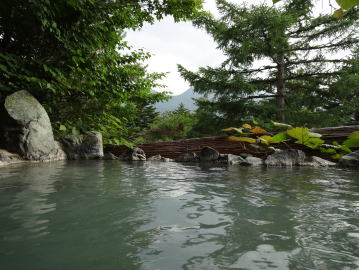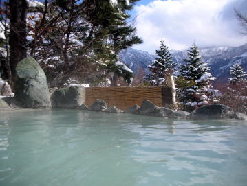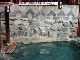| 晴れていれば北アルプス連峰を見ながら入れる絶景の露天風呂。湯花が漂い白濁しているので足元に注意しましょう。 |