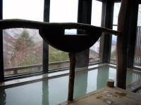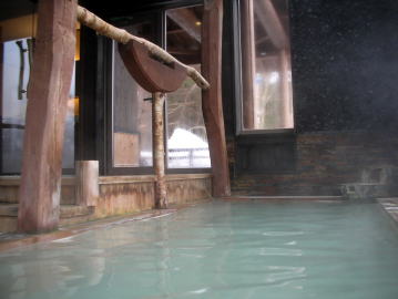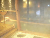 | 乳青色の硫黄泉がかけ流される湯舟は檜造り。檜の香りが気持ちいい。夜は巧みな間接照明で昼とは違った雰囲気を楽しむことができます。 |