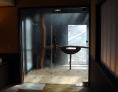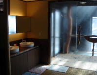 | 脱衣所もとてもきれいです。床暖房の畳、座り心地のいい椅子、間接照明、ガラス張りの扉から見える湯舟・・・温泉に入る前から気持ちよくなります。 |