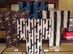 岡信孝氏コレクションのすばらしい銘仙が展示されています。銘仙は明治、大正、昭和期に作