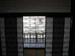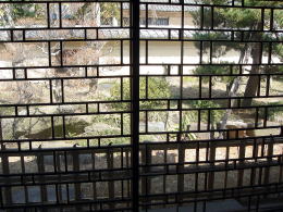 奥座敷の凝った造りの障子戸とガラス戸。ガラスは外の景色がゆがんで見えて、それがまた