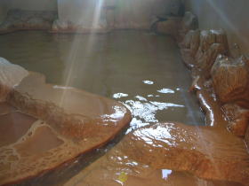 | 始めに書いた加賀井温泉一陽館の湯と松代荘の湯、分類上はほぼ同じ泉質の茶褐色の湯ですが、泉温は違い、一陽館は熟成されたマイルドな浴感のぬる湯、松代荘はストレートな強さを感じる熱い湯です。夏場は温めの加賀井温泉、冬場は熱い松代温泉という入り分けもよいかもしれません。 |