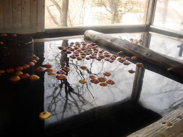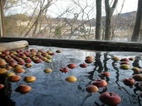 内湯といっても2面が大きなガラス張りでとても明るい雰囲気。10月から3月は「初恋りんご風呂」と名付けて湯舟に信州りんごが浮かべられています。100個近くあるでしょうか。甘酸っぱい香りが漂っています。