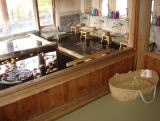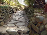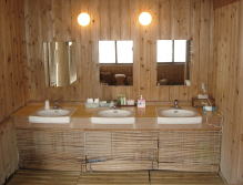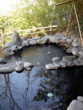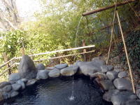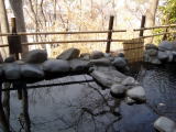 | 露天風呂は2槽あって、手前が加温湯、打たせ湯がある方が源泉かけ流しです。旅館によっては浴場が男女で大きさや形状が違ってしかも入れ替えにならないところもあるのですが、中棚荘の場合は男女ほぼ同じ造りになっていて、うれしい限りです。 |