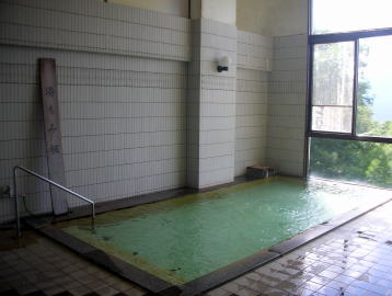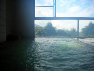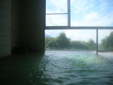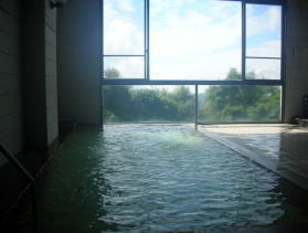 | 大きな内湯が男女それぞれ1つずつ。至ってシンプルですが、大きな窓からの眺めもよく、清潔感のある気持ちの良い浴場。やや熱めで、薄っすら緑色の透明な湯には白い湯花が舞っています。 |