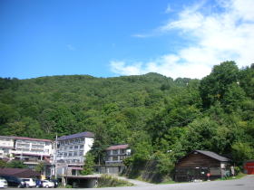 発哺温泉の中心部(右の写真)を過ぎ、やや細い砂利道を数百メートル進むと西発哺温泉ホテルに到着です。冬はスキー客で賑わうのでしょうが、初秋のこの日は駐車場に車もなく、静かな午後を迎えていました。 |