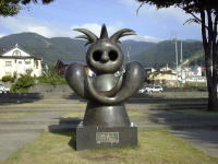 | 野沢温泉は文化人の愛する湯でもあり、故岡本太郎さんもその一人。写真左は太郎さんデザインの「湯」の文字で、クアハウスのざわではタイルに描かれたこの文字を見ながら入浴できる。写真右は村役場前にある太郎さん作の像「乙女」。氏は名誉村民第1号でもある。 |