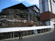 小布施の町の中心からリンゴ畑を抜け、車で5分ほど走るとおぶせ温泉穴観音の湯に到着。かなり広い駐車場ですが、土曜日の昼下がりということもあって満車に近い状態です。白く細長い建物はエレベーターです。 |