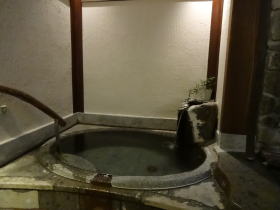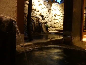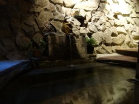 湯舟は2つ。ひとつは深めで熱め、もうひとつは温めで寝湯または半身浴の湯舟。2013年4月にリニューアルして、ミニ洞窟風呂のようないい雰囲気になりました。
