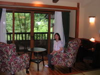 アンティーク調の椅子はクッションと肌触りがいい感じ。 ベランダから見る木々の緑と部屋の間接照明がとても落ち着きます。