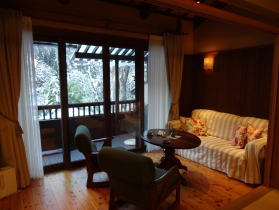 | 仙寿亭の広縁の椅子は部屋によってすべて違うそうです。この部屋の椅子はシックな雰囲気。座り心地もとてもいい。 |