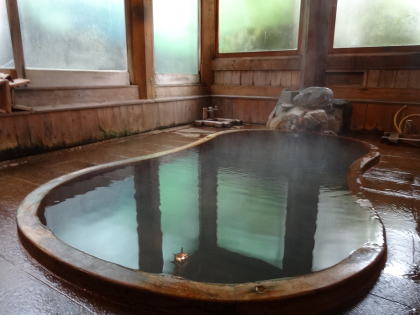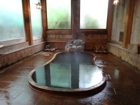 昭和11年に作られた浴場。瓢箪型のほのぼのとした雰囲気の湯舟です。4〜5人が適正定員。チェックインから午前0時までが男湯になっています。