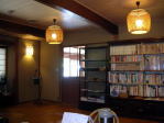 | 浴場を出たところに談話室があります。お茶や冷水が用意され、本棚には『のらくろ』や『サザエさん』などの漫画や信州の民話、写真集、温泉や郷土料理の本があってくつろげます。 |
