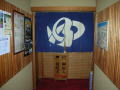 玄関では野沢温泉の木造道祖神がお出迎え。 |