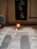 我々夫婦にとって良い宿であるためのポイントはいくつかありますが、寝具もそのひとつ。住吉屋のふとんは寝心地がいい。やなぎ妻はふとんカバーの肌触りとデザインも気に入りました。長野市にアトリエを持つ宮沢千賀さんのデザインで、浴衣や座布団、テーブルランプほか随所に宮沢さんの作品が使われています。 |
