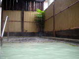 | 露天風呂は4、5人が定員の小ぢんまりとしたもの。目隠しのために囲いがしてあって眺望はゼロですが、温めなので長湯ができます。 |