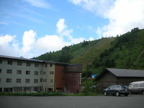 9月中旬、エメラルドグリーンの硫黄泉を味わおうと、志賀高原・硯川ホテルに立ち寄りました。玄関の真正面には標高1,800mの前山がデーンと構えています。 |