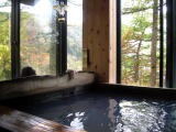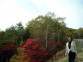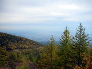 | 小諸の街から高峰高原へ向かってチェリーパークラインをぐんぐん上ります。坂はきついですが道はよく、30分弱の快適なドライブ。写真は車坂峠手前のパーキングから見た景色。紅葉がきれいでした。目指す高峰温泉は高峰高原ホテルの先を左折し、スキー場の中の道を1kmほど進んだ所にあります。 |