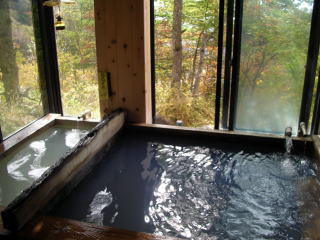 | 湯舟は2つ。右の広い方が加温浴槽、左が源泉浴槽です。源泉温度が36℃弱なので加温がメイン。浴槽内温度41℃に加温しています(循環とかけ流しの併用)。湯舟は5人まではなんとか入れる大きさ。湯はうっすらと青白色を帯びています。 |