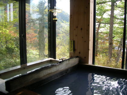 入浴料金500円を払っていざ浴場へ。高峰温泉には2つの内湯と2010年秋にできた「雲上の露天風呂」がありますが、日帰り入浴ができるのは内湯の「ランプの湯」です。 |