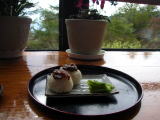 湯上り後はお休み処「朝霧」でコーヒーやおはぎ、おやき等の軽食を食べることができます。我々が注文したのはくるみ味噌おはぎ(500円)。野沢菜漬も美味しかったです。