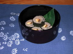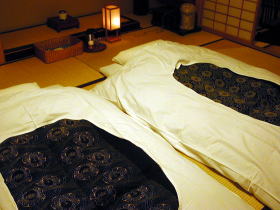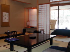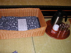 これまでは食事処で朝食をとって部屋に戻ると布団がきれいに片付けられていたのですが、今回はチェックインして部屋に通されたときに、翌朝布団を上げるか敷いたままにしておくかどちらがいいかを聞かれました。二度寝こそ最高の贅沢と心得るぐうたらな我々は、もちろん「敷いたまま」をチョイス。でも朝食後は布団を上げてきりっとした部屋でお茶を、という方も当然おられるのでしょう。どちらでも選べるというのはいいサービスだと思います。 |