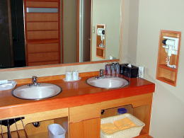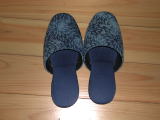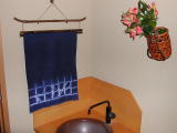 | お手洗いの手ぬぐいも洗面所のスリッパも藍染め。 |